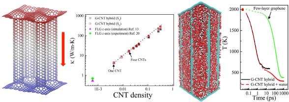 声子学与热能科学中心陈杰研究员与瑞士苏黎世联邦理工学院(ETH) Koumoutsakos教授研究小组合作,提出了一种显著提高石墨烯层间导热性能的新方法:用sp2共价键(强相互作用)来代替石墨烯层间范德华力(弱相互作用),构造无缝连接的石墨烯-碳纳米管混合结构。通过计算机模拟,该团队发现相比于范德华相互作用,共价键连接极大地提高了石墨烯中的晶格振动模式(声子)在垂直方向的传输系数,使得该混合结构沿垂直方向的热导率比相同厚度的多层石墨烯高出2个数量级,并且该混合结构的热阻比最先进的(the