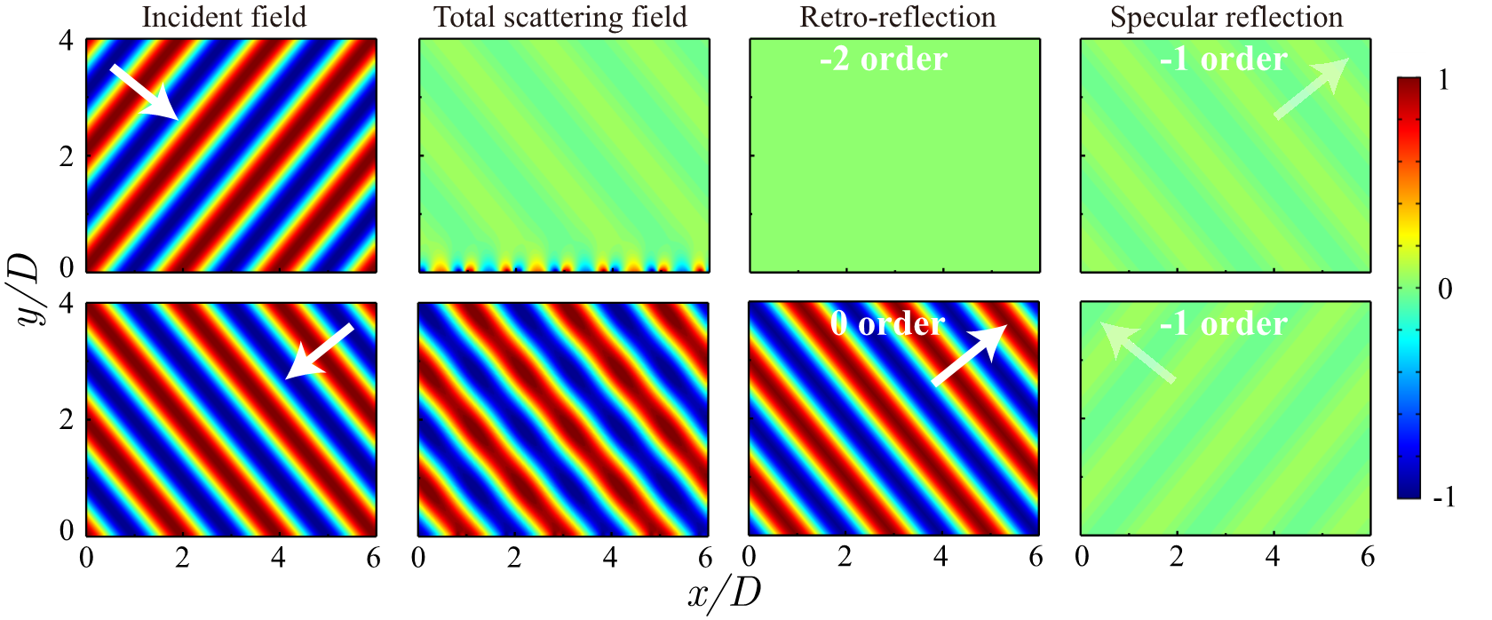 图3 上下行分别展示了声波左入射和右入射时声压的理论分布情况,从左到右分别为:入射场、总散射场、逆反射场和镜面反射场。