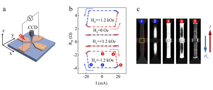 图 2 自旋力矩驱动磁化状态翻转的测量示意图(a), 8 nm L10相FePt的电测量结果(b)和磁光测量结果(c)。