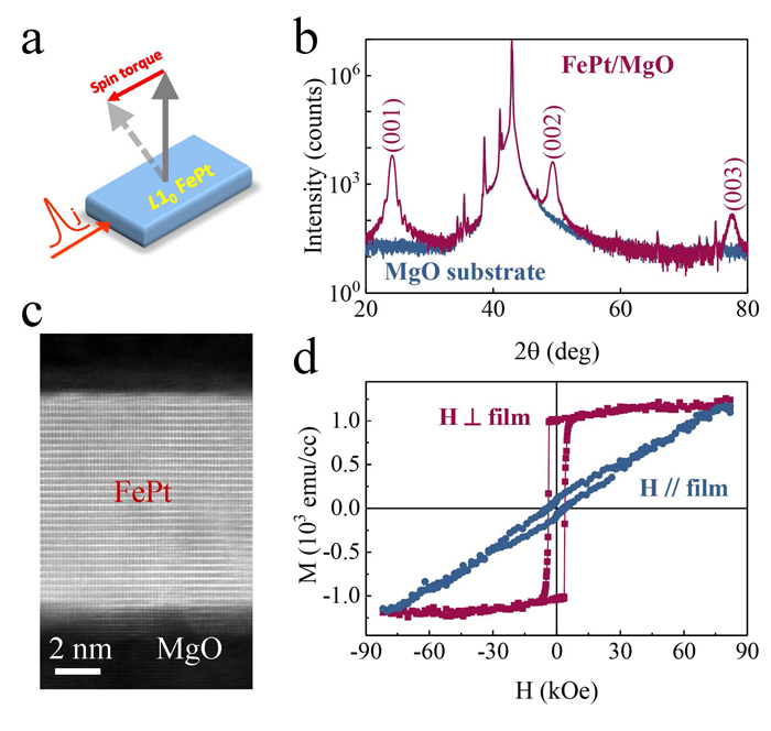 图1 L10相FePt单层膜中自旋力矩示意图(a),晶体结构的XRD表征(b)和TEM表征(c),磁性表征(d)。