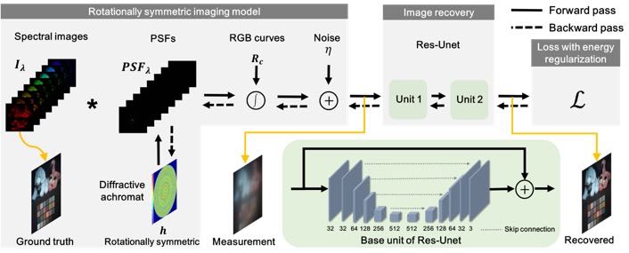 精密光学工程研究所的顿雄博士,提出了基于同心圆环分解的成像模型计算降维理念,并进一步结合能量正则化,成功地将端到端设计框架的内存需求降低了一个数量级。这使得研究团队首次实现了端到端设计8mm口径、31个消色差波长的衍射光学元件。实际成像效果验证了其优异的成像性能。镜头有效微结构厚度仅2微米,其实际厚度仅取决于结构所采用基底厚度,理论上可以薄至数百微米。该设计方法为基于衍射光学元件的轻薄计算成像系统发展铺平了道路,有望将轻量化便携式计算摄影引入全新时代。