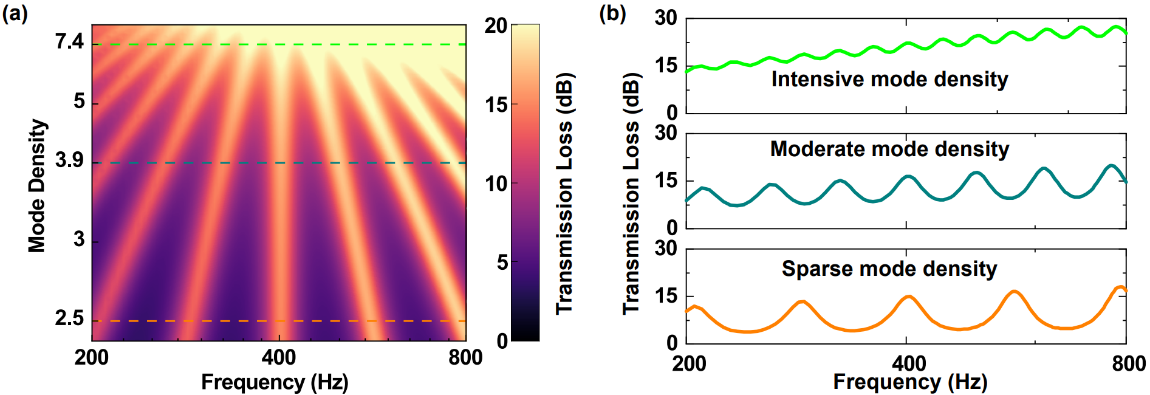 图2(a)宽频范围内不同模式密度的透射损失(TL)。(b)稀疏、中等和密集模式密度的典型情况的TL曲线。
