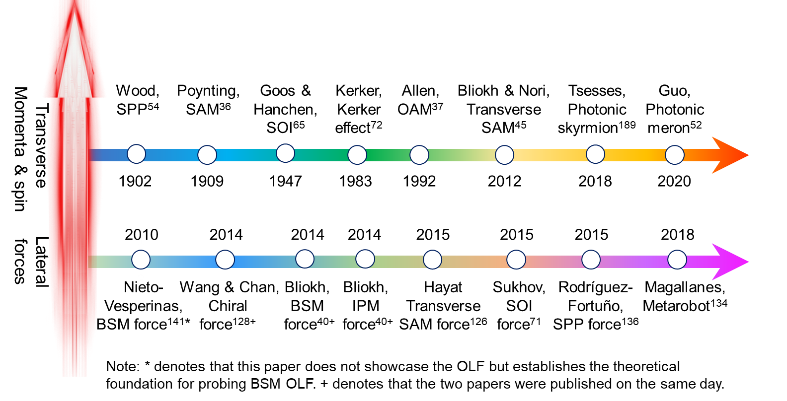 在综述中,该团队首先介绍了光动量和光力的理论基础,然后分别介绍了光横向动量和横向光力的重要发展历程,如图2所示。从物理机制上看,光横向动量由横向角动量和横向线性动量组成,横向角动量包括横向自旋角动量和光子skyrmion和meron等,横向线性动量转移包括定向侧向散射、自旋-轨道相互耦合、表面等离极化激元等。