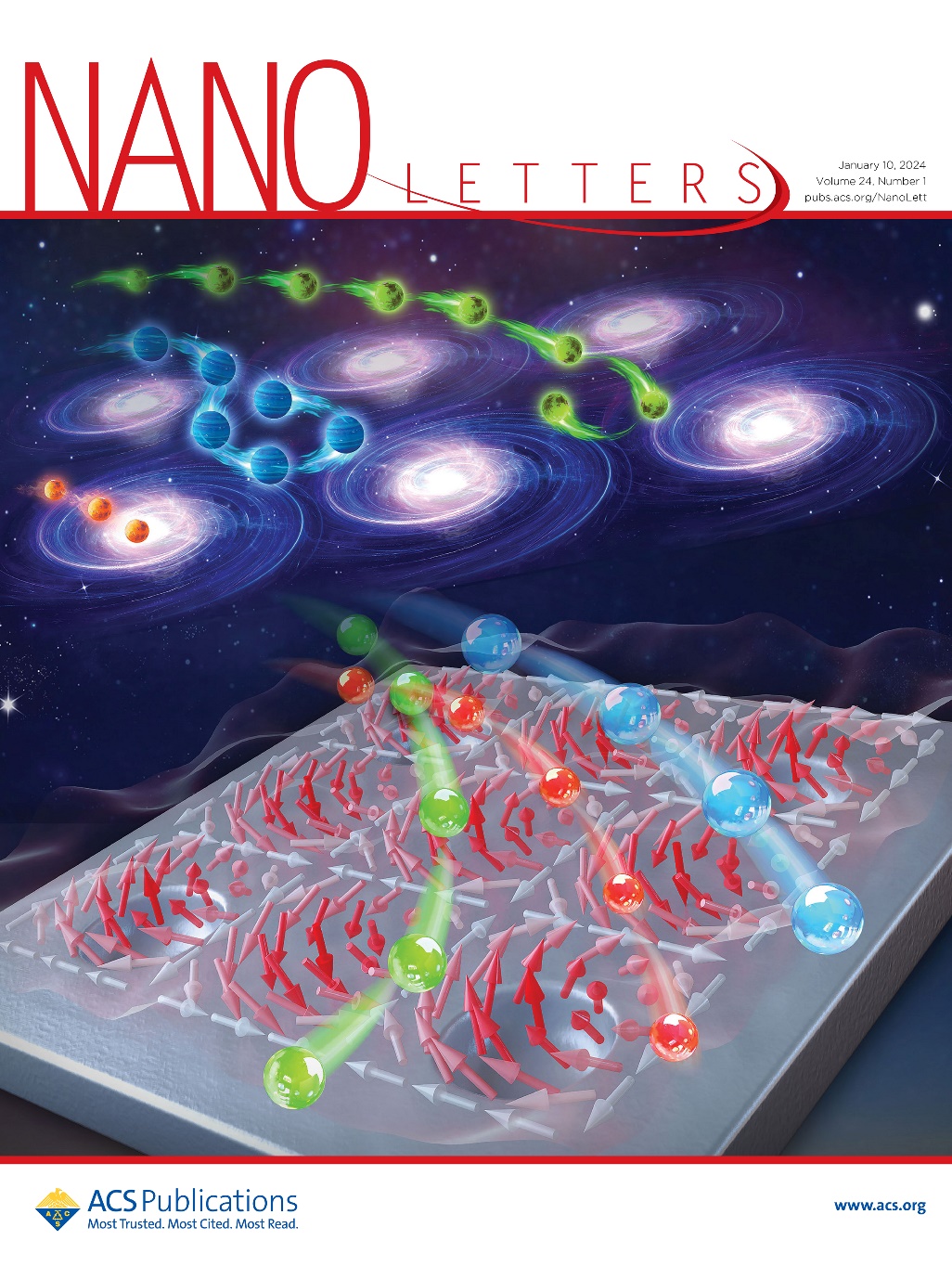 王占山教授、程鑫彬教授团队的施宇智教授提出了一种具有光学半子(meron)纹理特征的能流阵列,通过类多星系耦合机制实现了金纳米颗粒多轨道旋转,以及10nm精度分选。相关研究成果“Nanoparticle deep-subwavelength dynamics empowered by optical meron-antimeron topology”发表于《纳米快报》(Nano Letters),并入选2024年首月封面。