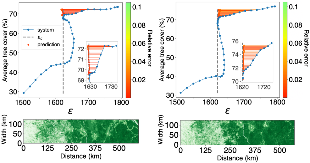 系统突变往往后果严重但属于稀有事件,因此可供训练的实际数据极少。为了解决这个难点,该研究采用了类似大模型的训练思路。先通过大量能够发生相变的数学模型生成模拟数据进行训练,得到一个经验丰富的预训练模型;然后利用实际小数据进行微调,捕捉和适应真实系统的隐含规律,完成迁移学习。研究团队以非洲植被生态系统为例展示了方法的实用性。通过综合分析卫星图像与气候变化数据,发现了非洲中部半干旱地区从浓密森林到稀树草原的突变现象:在突变发生前的多年间,年降水量减少200毫米而森林覆盖率仅减少5%;而一旦逼近临界点,年降水量减少10毫米却触发了森林覆盖率近30%的骤降。该现象揭示了降水量趋势监测等预警方法的局限,而本研究中提出的方法能够在突变发生之前对临界点进行更准确的预测(图2),为防灾减灾提供智能算法支撑。