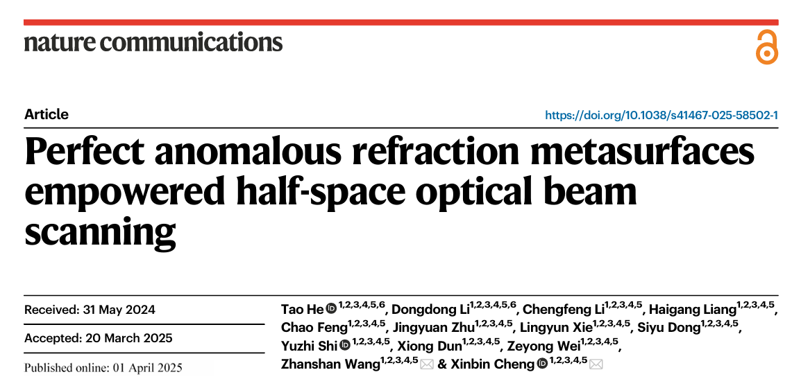 王占山和程鑫彬团队提出了一种基于完美异常折射超表面的高效率半空间光束扫描系统,为高效率异常折射超表面的设计开辟了新路径,推动了光探测和测距系统的实际应用。相关研究成果以“Perfect anomalous refraction metasurfaces empowered half-space optical beam scanning”为题发表于《自然·通讯》(Nature Communications)。