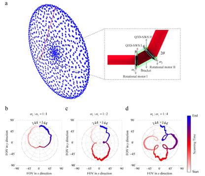 研究团队利用磁控溅射、电子束光刻、反应离子刻蚀等技术进行了准三维亚波长结构的制备,通过光谱表征,异常折射效率最高可达93%。在此基础上,研究团队进一步提出了级联准三维亚波长结构非同轴光束扫描系统,如图2所示。通过独立旋转两个级联的准三维亚波长结构,实验展示了半空间光束扫描,实现了144°×144°的视场,最大效率超过86%。通过降低旋转速率比,可以提高扫描轨迹密度,提升分辨率。该研究工作为高效率超表面的设计提供了新的思路,有望激发更多的高性能超构表面设备和系统。