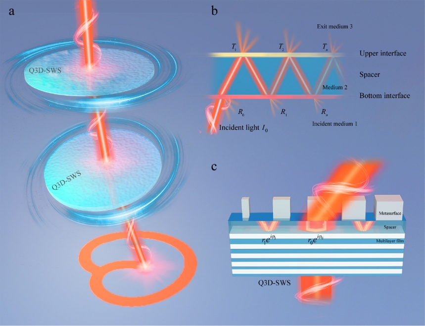 基于超表面的光束扫描设备因具有革新光探测和测距系统的潜力而受到光学和光子学领域的关注。然而,由于反射损耗和杂散衍射难抑制,高效率异常折射仍然是超表面领域的一个重要挑战,这限制了超表面光束扫描设备的效率和视场。鉴于此,王占山和程鑫彬团队提出了一种基于完美异常折射超表面的高效率半空间光束扫描系统,如图1所示。为实现完美异常折射,研究团队提出了通过增加纵向自由度激发多重散射过程优化对称性破缺的理念,构建了结合超表面与多层膜的准三维亚波长结构。为了消除反射损耗和杂散衍射,设计了一种具有特殊振幅和相位响应的多层膜,该薄膜对零阶传输波具有高透射率,对一阶传输波具有高反射率。通过上述设计,研究团队首次实现了完美异常折射,偏振不敏感的绝对效率超过99%。