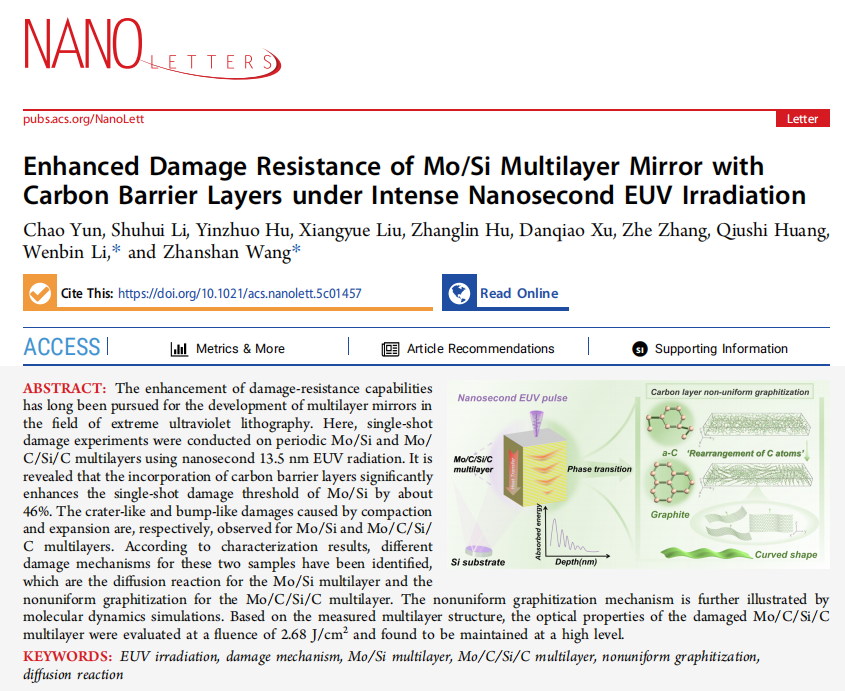王占山教授和李文斌教授团队在《纳米快报》(Nano Letters)在线发表了题为“Enhanced Damage Resistance of Mo/Si Multilayer Mirror with Carbon Barrier Layers Under Intense Nanosecond EUV Irradiation”的论文。该论文首次确定了碳阻隔层的引入能够有效增强极紫外光刻Mo/Si多层膜的抗极紫外辐照损伤性能。研究团队对传统的Mo/Si多层膜以及引入碳阻隔层的Mo/C/Si/C多层膜开展了纳秒极紫外辐照损伤探究,详细阐述了Mo/Si多层膜原子扩散反应的损伤机制,并首次揭示了Mo/C/Si/C多层膜受EUV辐照诱导发生的非均匀石墨化损伤过程。