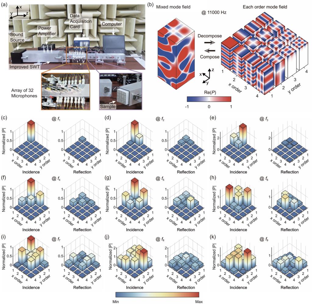 研究团队结合自主研发的多模态驻波管实验平台,验证了吸声体在平面波及混合模态下的吸声性能。该平台采用32个传声器分解高于截止频率的混合模式,精确测量包含平面波和高阶传播模态的吸声系数,充分验证了理论设计的准确性[图3]。