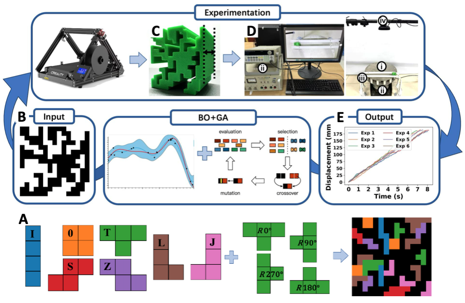 团队在表示、算法与实验三个层面形成协同创新:其一,提出 Tetris 多方块可制造编码,在15×15 网格用 25 个多方块拼形,并在生成阶段嵌入边界/不重叠/连通/静稳规则,使可行设计率由<0.1% 提升至 ≈15.8%;其二,构建离散友好的混合贝叶斯优化——随机森林代理配合自适应随机蒙特卡洛探索与约束遗传算法细化,在约 280 组“形态—性能”样本下快速收敛;其三,打造“硬件在环”平台,将实测数据实时写回模型,抑制预测漂移并保障高吞吐。