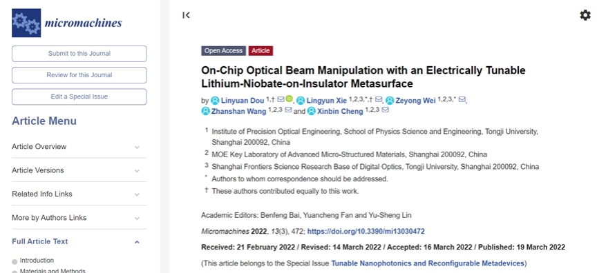 2018级物理学试验基地班本科生豆淋源以第一作者身份在Micromachines杂志上发表“基于绝缘体上铌酸锂的片上电可调波束调控超表面”(“On-Chip Optical Beam Manipulation with an Electrically Tunable Lithium-Niobate-on-Insulator Metasurface”)论文,Micromachines 期刊被Scopus、SCIE (Web of Science)和PubMed等众多数据库收录,主要聚焦微纳结构、设备和系统、应用物理方向的科学和技术。豆淋源于2021年8月进入程鑫彬教授和王占山教授课题组学习,在魏泽勇副教授的指导下学会了微纳光学基础理论、数值仿真方法,并提出了一种绝缘体上铌酸锂(LNOI)上的超表面,借助该超表面可在LNOI片上实现电可调谐的聚焦、偏折等波束调控功能。论文通讯作者为性爱电影