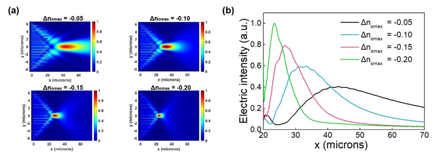 在片上,波长1550nm的y方向偏振光沿x正方向传播到超表面时,大部分光会被束缚在矩形刻槽之内,产生类似于波导内的传播。通过对单元刻槽仿真计算得知,在不施加偏压时,等长的矩形刻槽会在每个单元带来等量的相位;当对于每个单元分别施加不同大小的偏压时,其产生的电场会使得构成刻槽波导的LN折射率发生改变,从而使得光穿过每个周期的刻槽波导之后产生相位差异。每个周期上施加的电压是相互独立的,但由于超表面结构的对称性以及实现聚焦功能所需的波前相位的对称性,整个超表面的功能由9个大小不同、可连续调节的偏压控制,Δnomax来代表某种聚焦状态下所有周期中施加的最大偏压带来的LN寻常折射率变化值,超表面的聚焦效果及其动态调节如图2所示。