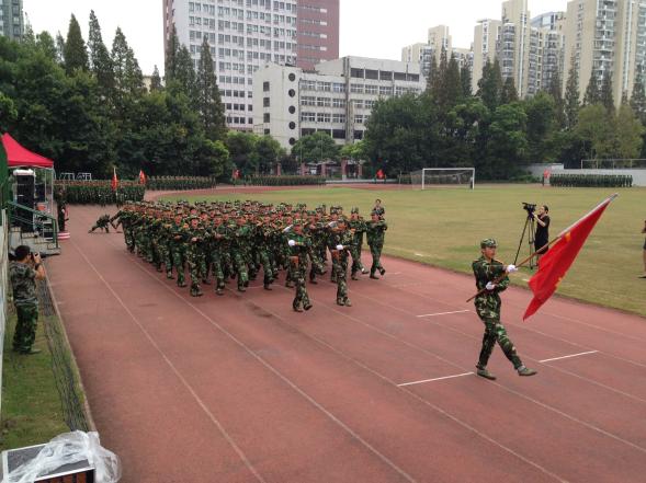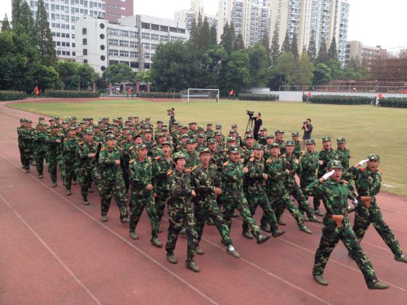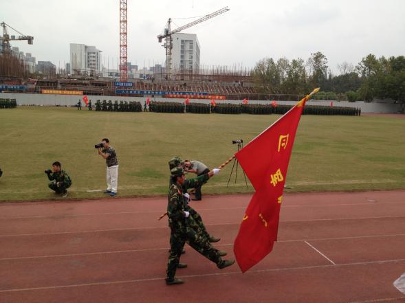 学院院长陈鸿教授,党委书记周斌教授,副书记考书健、程茜老师,声学所所长毛东兴教授及2012级班主任等和军训学生合影。