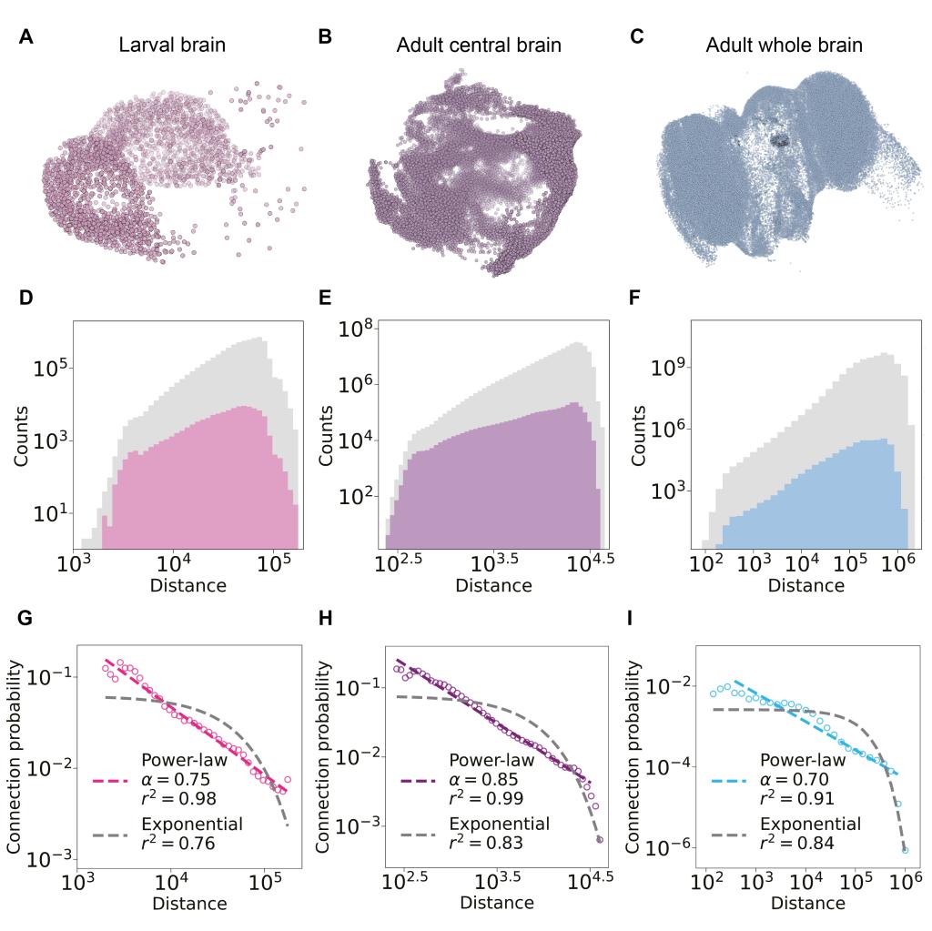 图1、果蝇联接组里的几何幂律。(A-C)幼年果蝇,成年果蝇中央脑区及全脑神经元三维坐标图。(D-F)神经元之间的所有连接可能性与实际存在的连接。(G-I)连接概率与几何距离之间的幂律标度,及其与指数距离规则之间的显著差异。