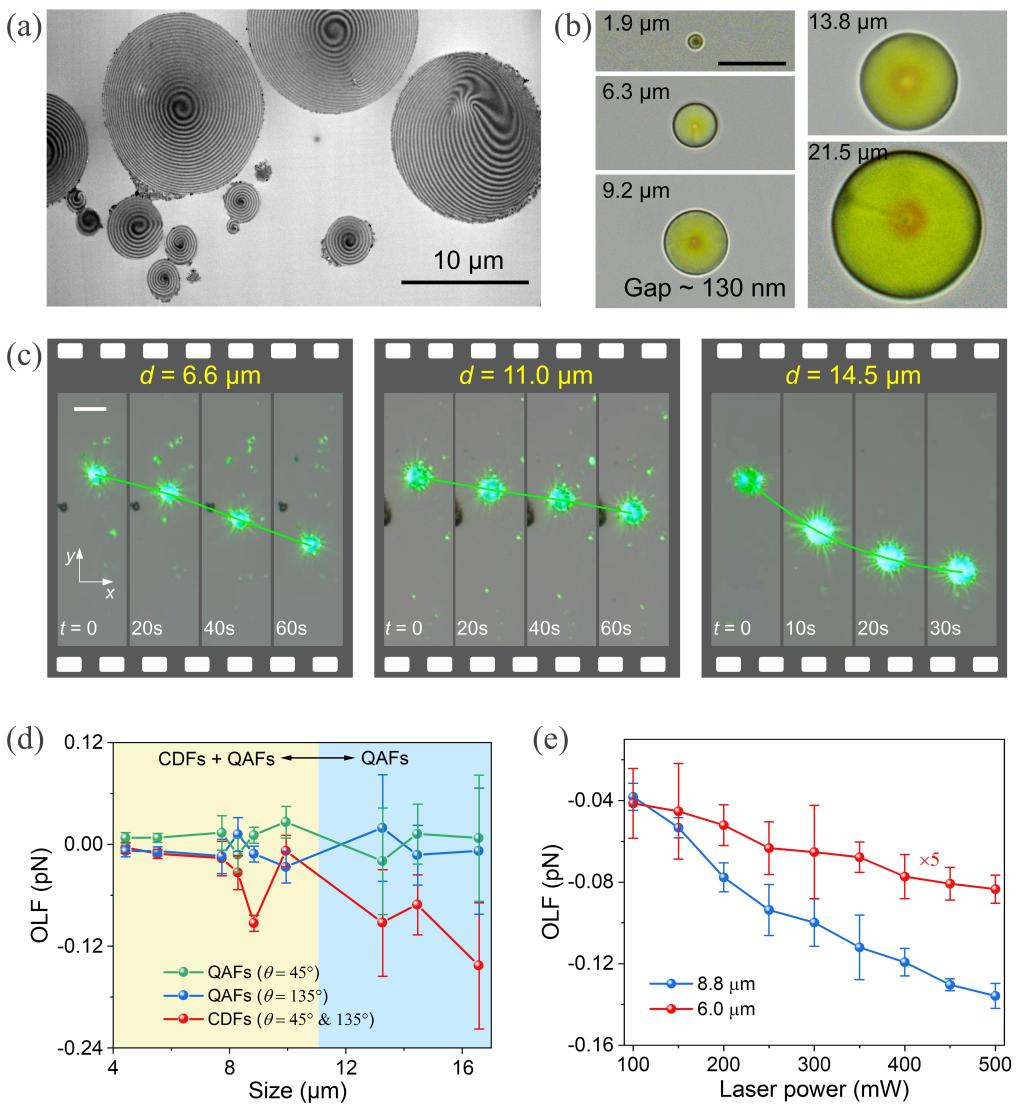 实验中的手性颗粒具有螺旋结构特征(图2a和2b)。实验中观测颗粒稳定的横向位移,进而得到颗粒所受的OLF。对于不同尺寸的手性颗粒,在同一种圆偏振光照射下,受到的OLF不同(图2c)。该研究从实验上验证了理论中预测的对于不同尺寸的颗粒,光力的主导项不同(图2d)。